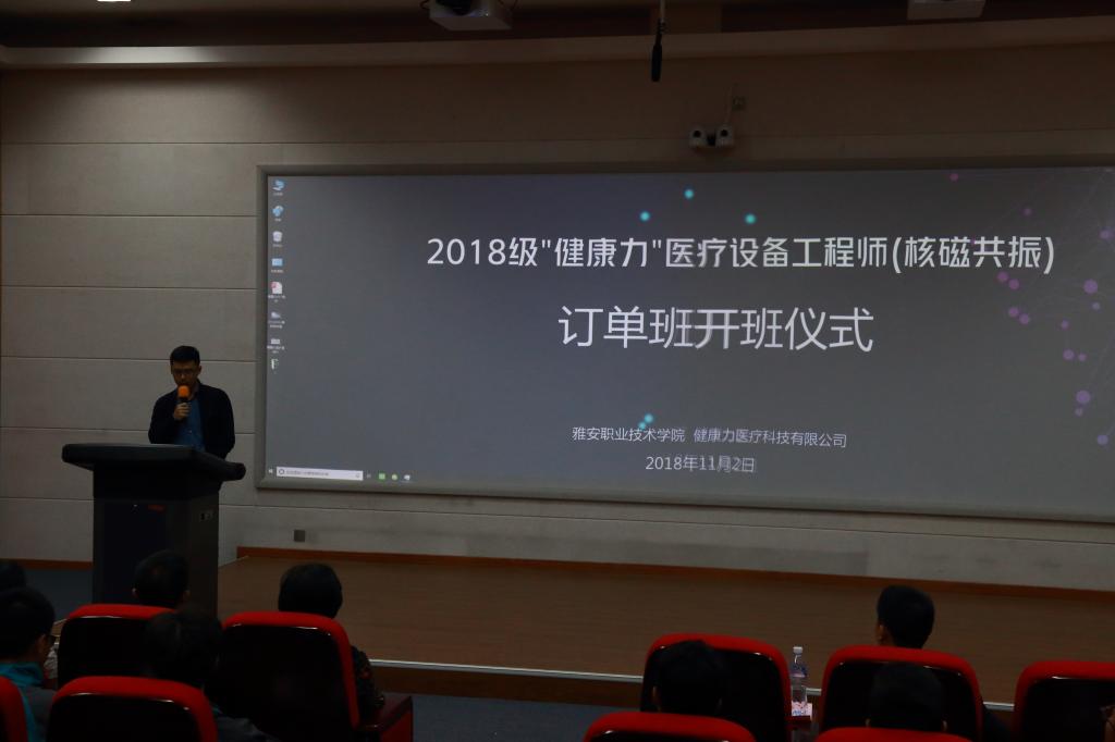2018年11月3日,williamhill2018级 “健康力”医疗设备工程师订单班开班仪式于经开区2204会议厅隆重举行,这是公司与健康力(北京)医疗科技有限公司联合培养的第2届订单班。参加仪式的有williamhill经理王梅、副经理吕波、党总支副书记唐翠微、专业负责人李燕、健康力四川分公司总经理肖春江、副总经理张涛、高级工程师韩跃等企业相关人员以及订单班全体员工。
