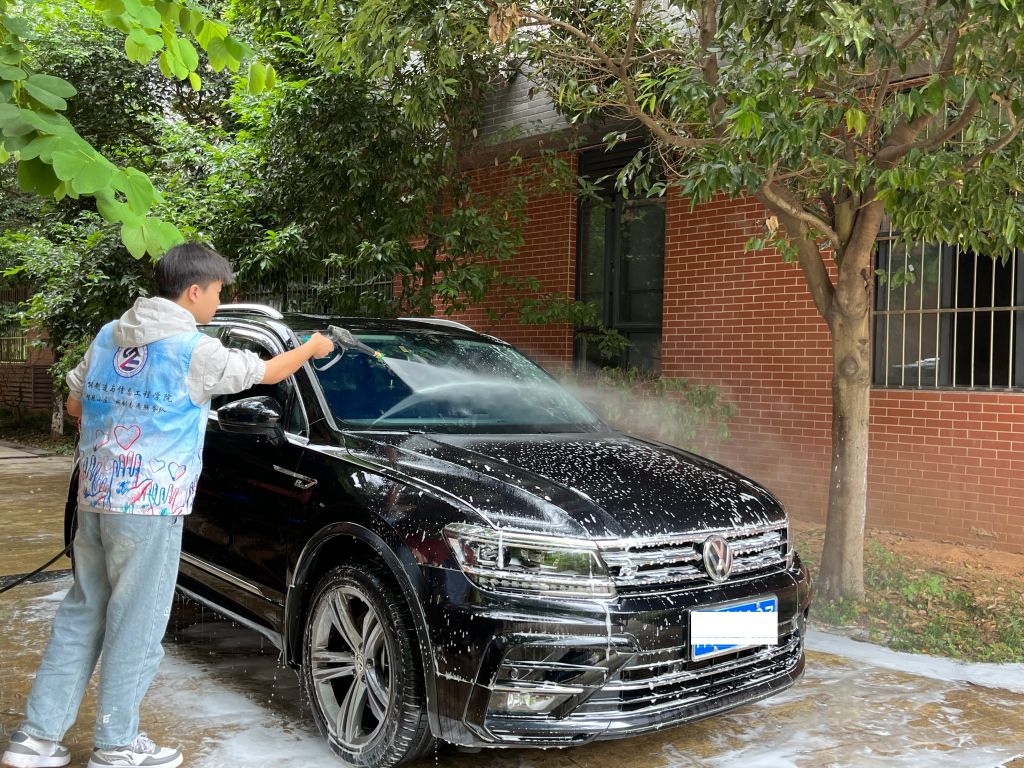 活动现场,志愿者们分工明确,在专业课教师贺仕伟的指导下,从接待、喷水、喷洒泡沫、冲洗、擦干到交车,有条不紊地完成着每个环节的任务。大家以劳动为荣,乐在其中,力争为公司教职工们提供优质服务。经过认真细心、热情到位的服务,一辆辆原本沾满灰尘的小车,瞬间焕然一新。志愿者们的热心服务,赢得了广大教职工们的称赞。