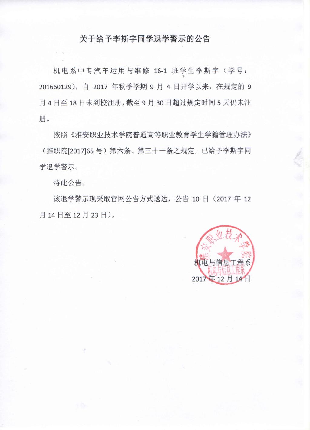 关于给予李斯宇同学退学警示的公告