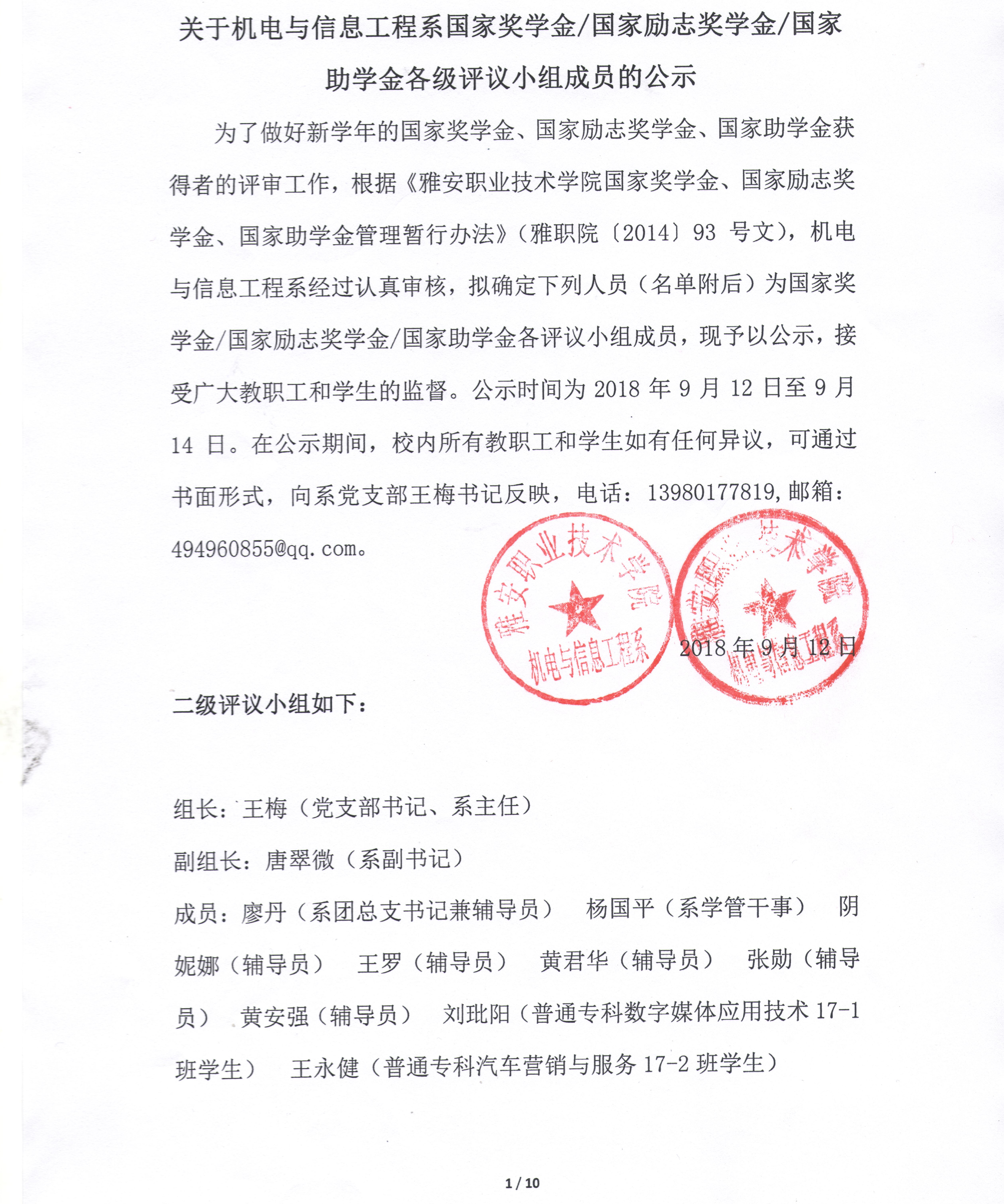 关于机电与信息工程系国家奖学金、国家励志奖学金助学金各级评议小组成员的公示