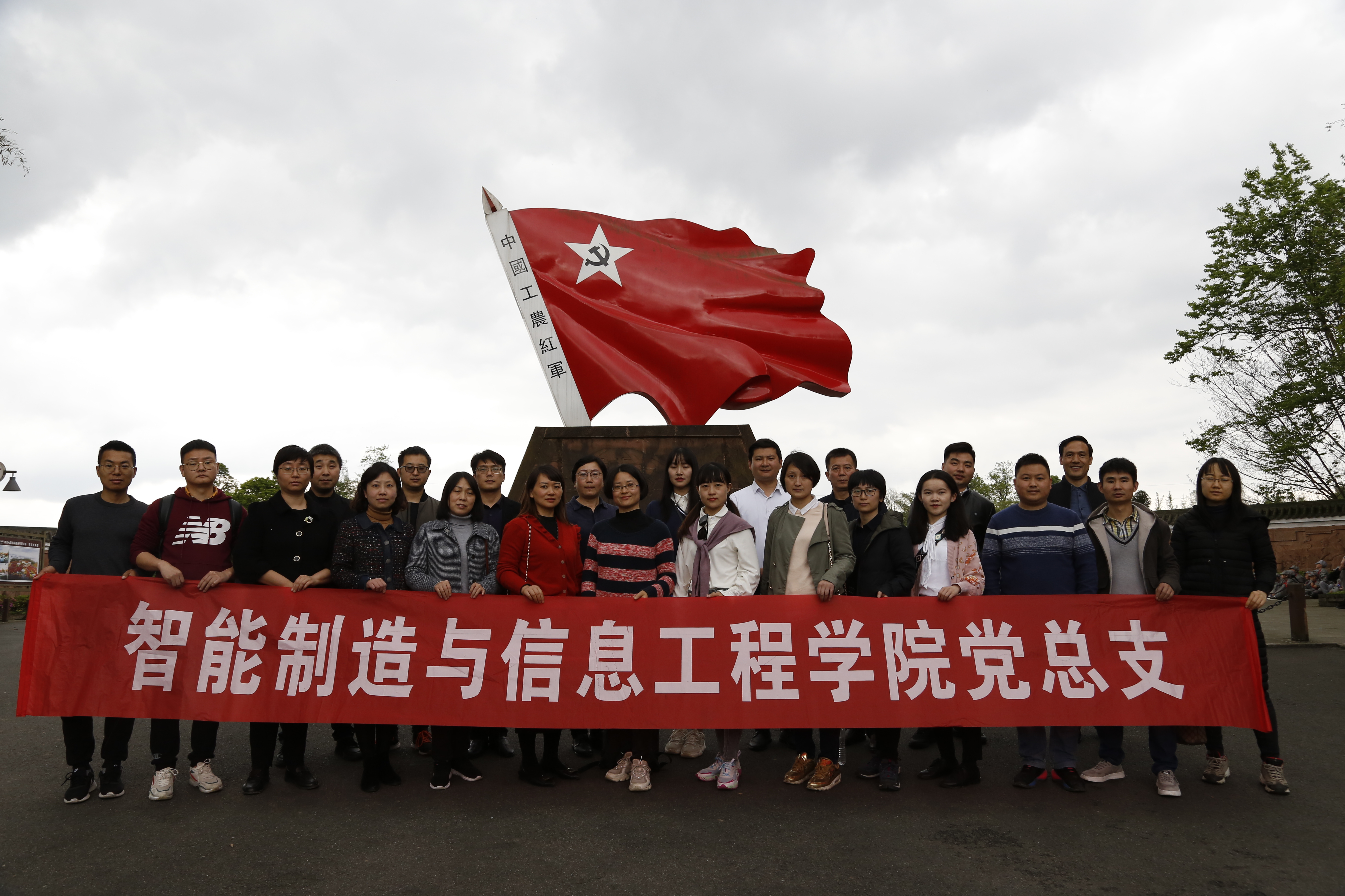 最后教职工党员在天全红军村党旗雕像下合影留念。