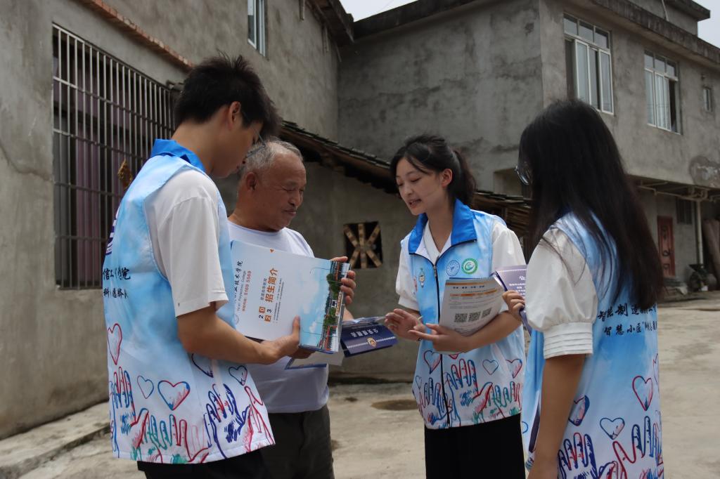 在小落村活动现场,志愿者们首先分组开展志愿服务活动,一组志愿者入户结对留守老人,亲切与他们沟通交流,关注老人身心健康,还教老人使用智能手机,帮助他们跨越“数字鸿沟”,畅通与社会的联系;一组志愿者沿村进行防诈宣传,指导村民下载国家反诈app,提高村民防范诈骗安全能力与意识,做到宣传全覆盖。随后师生携手发挥专业优势,分类开展专业技能服务,有为村里办公人员、青少年进行办公软件教学培训的;有入户为村民进行农业机器设备维修、提供务农中技术难点咨询的;还有带着村民将直播开在果园里,助力农产品增收。