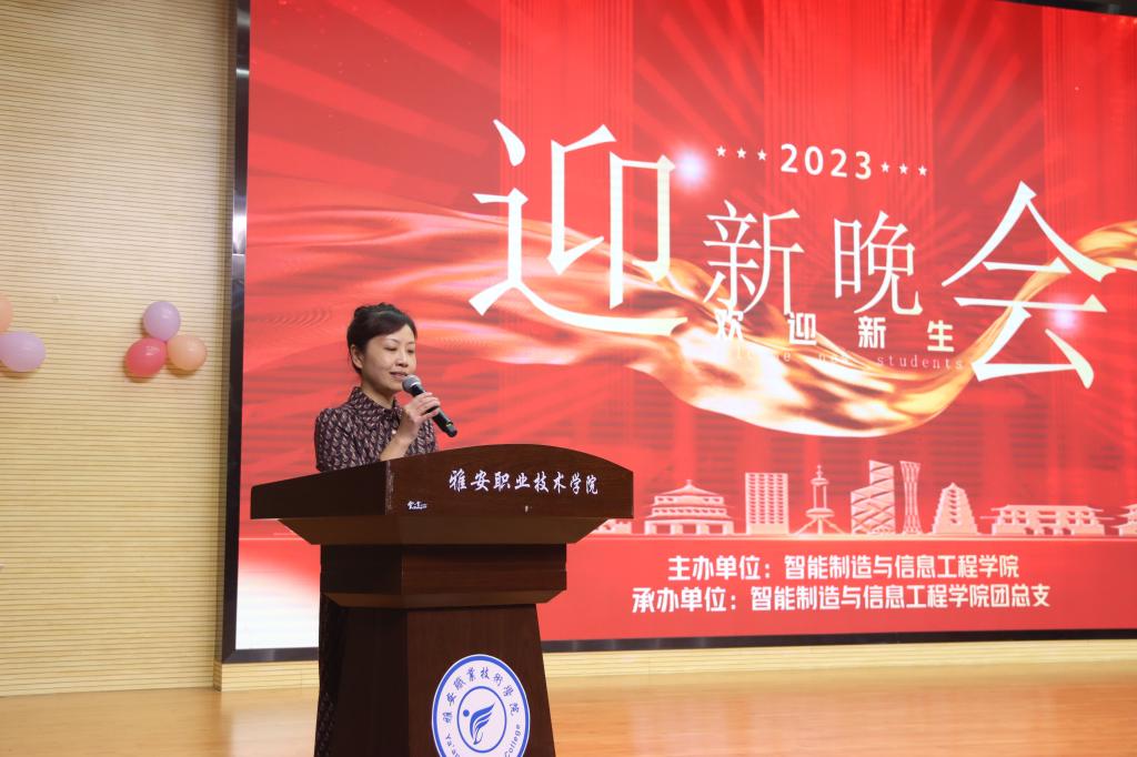晚会伊始,智能制造与信息工程公司党总支书记唐翠微致辞,代表全院师生对2023级全体新生表示热烈欢迎和衷心祝福,鼓励同学们未来在雅职的学习中,将“小我”融入“大我”,做担当强国建设、民族复兴大任的建设者和接班人。紧接着长嘴壶才艺展示拉开演出序幕,幕布表演剧、舞蹈《NXDE》、彝文化节目、藏文化节目、走秀等十余个精彩节目交替呈现,表演者通过歌舞、表演剧、传统文化表演等形式向同学们展现了朝气蓬勃的老员工活和丰富多彩的校园文化。会中还穿插播放了新生家长们和辅导员录制的暖心鼓励视频,让同学们感动不已;可爱的玩偶时不时与台下同学精彩互动,让晚会高潮迭起,欢呼声一浪高过一浪,最后走秀表演为晚会划上了圆满的句号。