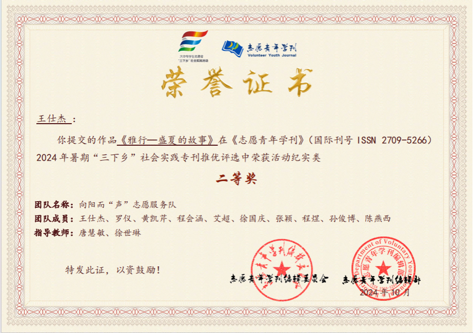 近期,《志愿青年学刊》公布了2024年暑期“三下乡”社会实践专刊发布录刊及评优结果,由徐世琳老师带队的向阳而“声”志愿服务队成员撰写的《雅行--盛夏的故事》通过编委会审核,被《志愿青年学刊》2024年暑期“三下乡”社会实践专刊收录,并在作品评选中荣获实践活动纪实类二等奖。